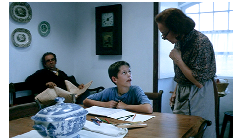 フリップは、家に帰り、2階にある広々とした居間に入って行く(1枚目の写真、①はフリップ、その右に階段がある、②は祖母、③は母)。フリップは、まず祖母にキスをもらって 「えらく静かね」と言われ、次いで母にキスをもらう〔何れも頬〕。そして、イスに座ると、さっそく母が、「学校は ちゃんとできた?」訊く。「したよ」。「何をしたの?」。「昨日と同じ」。祖母が、「今日は、新しいこと、何もしなかったの?」と訊く。「作文を書いたよ」。「何の?」。「この前の休暇について」(2枚目の写真)。母が 「何を書いたの? シントラへの旅行で、お祖母様が転んだこと?」と訊く。祖母は 「笑っただけで 助けもしなかったこと?」と、意地悪く 付け加える。