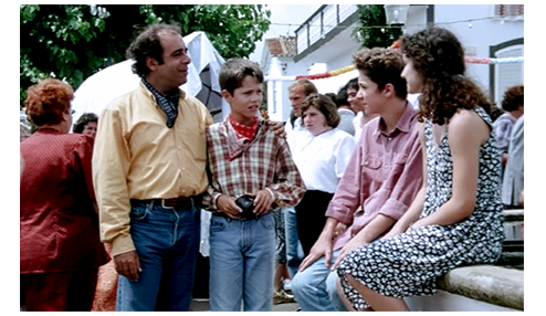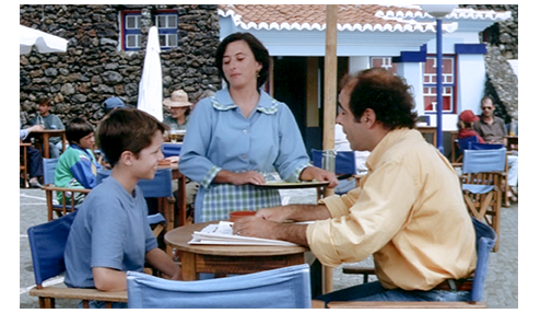 フリップと父は、このあと、町のカフェに出かける。ぶすっとした態度のウェイトレスが注文を訊きにくる。父に飲み物を訊かれたフリップは、冗談に、「ジン・トニック」と言い、父を慌てさせる(1枚目の写真)。そして、先ほどの会話の続き。父は 「お前が、寝室まで来たって話、母さんにしたことあるか?」と 改めて訊く。「気は確か?! そんなの、母さんとする話じゃないよ!」。これで 父はホッとするが、「母さんには話さなかったけど、お祖母ちゃんとは話したよ」の一言でゾッとする。「お祖母ちゃんだと?!」。「そうだよ。なら、誰に訊けばよかった? 近所の人?」。「彼女、何て言った?」。「僕が、またドアまで聞きに行ったら、地獄に連れて行ってやるって」。その時、注文した飲み物が持って来られ、会話は中断する。そして、カメラの角度が変わり、このカフェ・テラスが海に臨んだ場所にあることが分かる〔いつもの町ではない〕。この後の会話は、今朝のバスタブでの会話より さらに際どく、この映画が現実だとしたら、13歳の少年には全く相応しくない〔映画初出演のアフォンソは、赤面したのでは?〕。「母さん以外の女性とセックスしたことは?」。コーヒーを飲んでいた父は、思わずむせる。「あるとも」。「みんな同じ?」。「何が?」。「セックスだよ、一人一人違う?」。父は、まともに答えられず、「知らん、知らん」と打ち切り、「何て、おぞましい」と叱る。「じゃあ、僕、このこと誰に訊けばいい? お祖母ちゃん?」。この、もっと “おぞましい” 提案に、父は、「お祖母ちゃんとは話して欲しくない。父さんでいい」と 譲歩。「じゃあ、誰とセックスしても同じかどうか 教えてよ」。この ひどい質問に対し、父は、直接答えるのを避け、「人はお互いに違うものだ」という一般論を持ち出し、さらに、「大きくなれば分かる」と逃げる。そのあとも、フリップは許してくれない。「最初にセックスしたの、幾つの時?」。「16歳だ」。「遅いね。もっと早くできなかったの?」。「もちろん、できたさ」。「じゃあ、なぜ しなかったの?」(3枚目の写真)。「機会がなかったからだ! 何てこと言わせる」。フリップは、一番知りかったことを訊く。「ジョアナのこと どう思う?」。「楽しい子だ」。「セックスしようって誘ってもいいかな?」。「さあ… どうかな…」。「で?」。「やめといた方が…」。「僕より年上だから?」。「ああ」。「分った。やめとくよ」〔現実の世界では、小心なフリップには何もできない。空想の世界なので 目一杯 羽目を外してみたが、やっぱりできなかった〕。