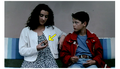3人は 湖畔に行く。ジョアナが 「ここには、家族でバカンスに?」とフリップに訊く。「父さんとだけ。君たちは?」。ペドロ:「俺たちには親父がいない」。「死んだの?」。ジョアナ:「いいえ。2年前、アメリカに働きに行ってから 一度も戻らなかったら、突然 離婚話が…」。「なぜ?」。ペドロ:「別の女とできてたんだ!」。「どうするの?」。ペドロ:「これからアメリカに行く」。「2人で?」。ジョアナ:「そうよ」。一連の会話のあとで、フリップは低い石塀の上に座り、花紋宝というタカラガイの一種を大事そうに手で撫でる(2枚目の写真/この貝は、後で2回出てくる)。そして、ジョアナに、「父さんがいないと大変じゃない?」と訊く。「大変よ。もし、このままいなくなって 無視でもされたら…」。フリップ:「一緒に住んでても、無視されたら?」(3枚目の写真)。ジョアナ:「そっちの方が最悪かもね」。