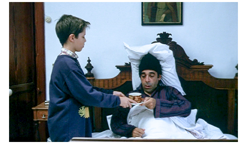 翌日の朝、父は髭を剃り、フリップは “信じられないほど小さな” バスタブに入っている〔これ1つしか置いてないようだが、大人もこれを使うのだろうか?〕。父は、「あのあと ジョアナに会いに行ったか?」と尋ねる。「うん」(1枚目の写真)。「恋してると話したか?」。「ううん」〔この “否定” は、①打ち明けたのに、恥ずかしいから否定したのか、①フリップは “Porque gosto(好き) de ti” と言ったが、父は “E disseste-lhe que estás apaixonado(恋してる) por ela?” と訊いたので、レベルの違いを否定したのか、は不明〕。「キスしなかったんだな?」。「してない」。このあと、フリップは尋常ではないことを訊く。「なぜ、父さんと母さんは、夜出かけた時か、日曜の朝しかセックスしないの?」。父は 「何だと? 何で知ってる?」と驚く。「寝室のドアまで何度も行って、セックスするの聞いてたから」(2枚目の写真)。「部屋まで来たのか?」。「ドアの前だよ」。「中には?」。「入ってない。だって、見るのが怖かったんだもん」。「どうして?」。「最初の数回は、何してるか分からなかったから、母さんを虐めてるのかと思ってた。何してるか知った後は、見るのが怖くなった」〔ここも、すごく赤裸々で、思春期の映画にはどうかと思うが、これも、フリップの空想の世界〕。