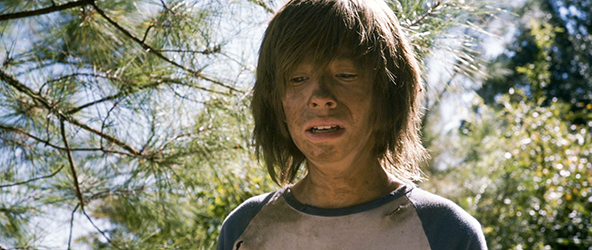ワット・キー〔Watt Key〕のデビュー作(2006)の映画化。原作のストーリーにほぼ従いつつ、判りにくい(回りくどい)箇所は簡略化した作品。“野生の少年” という題材はそれなりにあるが、2歳の時から、父親と2人だけで森の中で隠れ住んできたという設定は、初めて〔以前紹介した『Storm Boy』も、世間から隔絶された父との2人暮らしだったが、もう少し文明的だった〕。だから、主人公のムーンは、読み書きはできるが、不潔さは野生児なみという変わった組み合わせ。もう一方の準主役が、白血病で入退院をくり返してきた薄幸のキット。この2人が、児童保護施設で出会い、一緒に脱走して森の中で暮らす。ムーンにとっては、死んだ父とキットが替っただけの住み慣れた生活。キットにとっては、これまで味わったことのない開放的な楽しい生活。しかし、その代償は大きく、キットは白血病を再発し、入院し、最後には死んでしまう。しかし、6週間の楽しい生活は、キットにとって短い一生で最高の思い出となった。映画には、あと1人、重要な登場人物がいる。中学も満足に卒業できなかったくせに、父親が郡の判事なので巡査を15年もやっている “鼻つまみ者” のサンダースだ。サンダースとムーンは、出遭った最初から相性が悪く、それをサンダースが誇大に吹聴したことから、「悪ガキ」として児童保護施設に収容される。そこを脱走してからも、執拗につきまとい、捜索犬がいなくなると「食べられた」、拳銃を奪われると「撃たれた」と嘘をつき、殺人未遂で手配する。それを救おうとするのが、一時は引退した弁護士。キットとサンダースのどちらが欠けても、この映画は成り立たない。少年映画という観点からは、主役はムーンを演じるジミー・ベネットだが、キットを演じるユライア・シェルトンの多彩な表情が大きな魅力となっている。