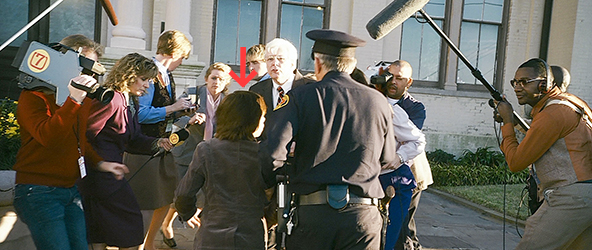 翌朝、警官が、ブレザーとネクタイなど出廷用の服を持って来る(1枚目の写真)。「それを着たら、出かけるぞ」。パトカーが向かった先は、裁判所。前には、多くの報道陣が詰めかけている。ムーンがパトカーから降りると、マイクを突きつけられ質問を浴びるが、ムーンは慣れないので、ただただ驚くばかり(2枚目の写真、矢印はムーン)。原作では、警察署を出る時、報道陣に囲まれる。裁判所には裏口から入り、そのまま檻に入れられる。1時間待ち、お呼びが掛かる。
