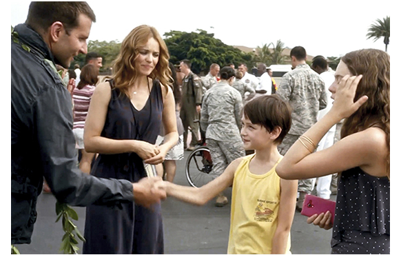 アフガニスタンで脚の骨を18ヶ所も折る重傷を負った後に退役したブライアン・ギルクレストは、大富豪カーソン・ウェルチに雇われ、軍から請け負ったハワイでの衛星打ち上げに係わる一種の「地上げ屋」として訪れた。そこで、ブライアンは相次いで2人の女性と会う。1人は13年ぶりに再会した元彼女のトレイシー、もう1人はお目付けのアリソン・イング(Ng)大尉。トレイシーはハワイに駐留する米軍の法医学部門とトップとして、ブライアンが空港に着いた時、偶然、兵士の遺体搬送式を仕切っていた。そして、2人の子供も同行していた。長男のミッチェルはビデオ撮影マニア。いつもカメラを持っていて、何でも映している。ブライアンが着く前から、彼を迎えに来ていた元同僚のレイシー大佐に、ビデオ・インタビュー。「レイシー大佐ですか」。大佐は、カメラに向かって、「イエスー・サー」とおどけてみせる。その後は、すぐにミッチェルの好きなハワイの神話の話になる。このハワイの神話が曲者だ。ハワイの四大神の1人ロノと、ハワイ創設神話の女神ペレのまつわるものだが、ネット上のあらゆる情報を探しても、ミッチェルが話してしているようなことは出て来ない。ハワイの神話には幾通りものバリエーションがあり、有名なペレのレジェンドでは、ペレがKahiki(一般にタチヒとされている)からハワイに移ってきたとされるが、そのカヌーには「On the canoe were Ku and Lono」という標記があることから、ロノも乗っていた。このレジェンドによれば、最初にハワイに移り住んだのがペレで、ロノは一緒にいただけ。一方、ハワイの神話では、宇宙を創造主として四大神クー、ロノ、カネ、カナロアが挙げられ、1ランク下のその他の神々の1人にペレが入っている。そして、その神話では、ロノとペレの接点はない。ところが、ハワイの神話マニアのミッチェルの話は、ロノとペレの際どい関係がメインになっていて、ブライアンのことを何度もロノかと訊く。これは、神話とは矛盾した内容で、この辺りもハワイの人々にとっては腹の立つ原因になっているのかもしれない。さて、ミッチェルのレイシー大佐への次の質問は、「ロノの再来神話って知ってます? カレンダーによると、今週、陽気なハワイの神様ロノが戻ってきて、火山の女神ペレと空に大惨事をもたらすんだ(wreak havoc in the sky)」(1枚目の写真)。しかしこの内容も、全くの虚偽。そもそもロノの再来する週など決まっていないし、ロノはペレと行動を共にしない。ましてや空を荒らすことはない。しかし、ロノ、イコール、ブライアンとすると、ブライアンは今週やってきて、危険な軍事衛星の打上げを先導し、衛星が軌道に乗れば強力な武器となる。「空に大惨事をもたらす」という言葉と合致する。それだけのために、こじつけ神話を捏造したのか? これは、ハワイの先住民族に対する冒涜だ。さて、その後、ブライアンが現れ、母が、「紹介するわ。こちらブライアン・ギルクレストさん」と姉弟を引き会わせる。「ミッチェルは10歳、グレイスは12歳よ」(2枚目の写真)。13年ぶりの再会で、12歳という微妙な数値が示すように、姉は実はブライアンの子供、夫はうすうすそのことに感ずいている(娘は知らない)。そこに、2人の父が期せずして現れ、2人が抱きつく。それから、ミッチェルがブライアンに、「ロト神のように戻ってきたの?」と尋ねる。「いいや、5日いたら さよならだ。新しいゲートを造るのに祈祷してもらう。しきたりなんだ、神話と遺骨と霊魂のために」。簡略化された、非常に分かりにくい説明だ。母は、「ねえ、夕食に来ない?」とブライアンを誘い、ミッチェルも「うんと、言ってよ」とブライアンに頼み、催促するように父を見上げる(3枚目の写真)。これでは、乗り気でない父も承諾せざるをえない。ミッチェルは、招待を承諾し去ろうとするブライアンに、「ハワイの神様ロノに詳しい?」と訊く。「知らないな」。「再来の神話では、ペレを助けて…」と言いかけ、お邪魔虫とばかりに、母に口を押さえられる(4枚目の写真)。