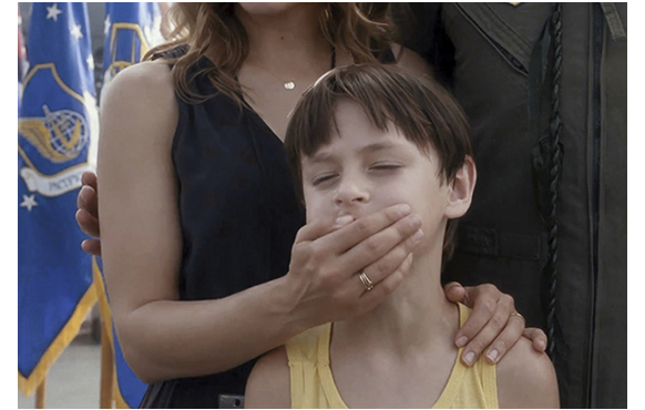 クウェートの任務から父が帰宅する。会話はいつも通り低調だ。母:「お仕事は?」。父:「ああ、いいよ」。「それで… 言うことはそれだけ?」。「ああ、いいよ。それじゃ」。席を立って、後を追う母を見る2人(写真)。父母の寝室での会話は、思わぬ方向へ。母は、「ウッディ、こんな沈黙 耐えられない。あなたはここにいて、私は出て行く」。「いや、違う。僕が出て行く」。そのまま、荷物も持たずに家を出て行く父。あまりにも突然かつ短絡的で、説得力も何もない。これも脚本の欠陥。欠陥の山だ。こんな脚本で映画を作ろうと思った製作者、監督の良心と常識を疑う。