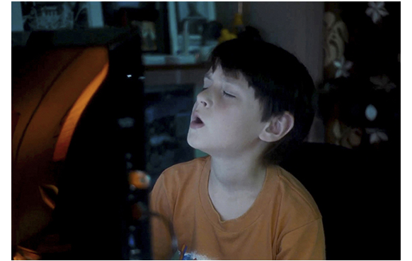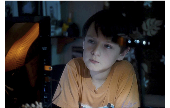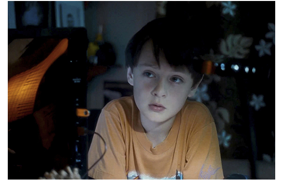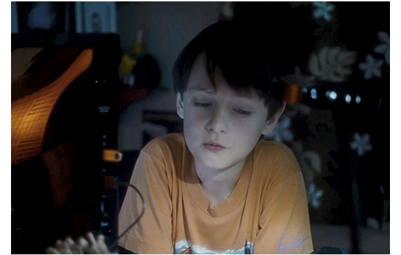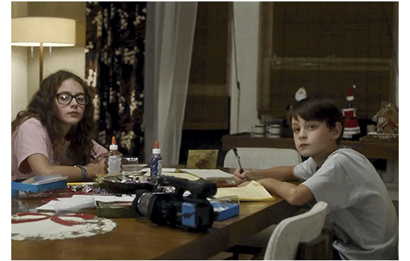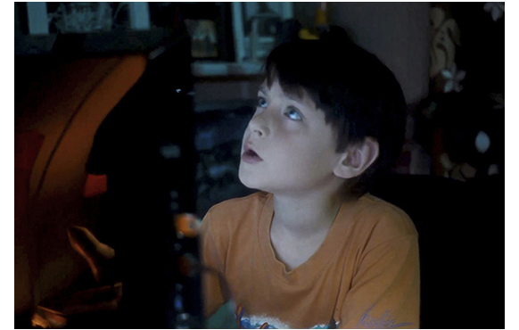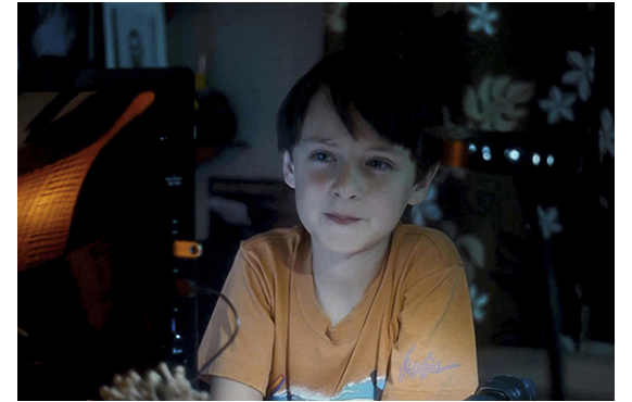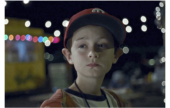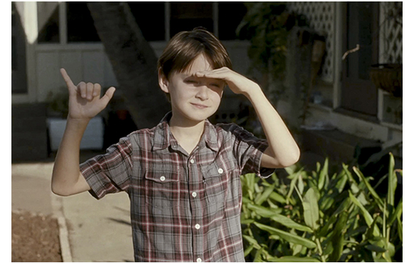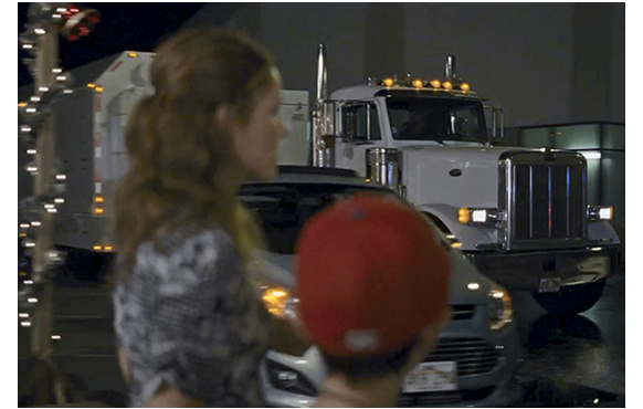 ミッチェルが、ビデオ撮影マニアなのは、大事な伏線なので、その後も、始終カメラを手にしている様子が紹介される。映画開始14分目。家では、母がランチの準備をしている。「ミッチェル、カメラを置いて、現実に戻ってちょうだい」と母が言っても、やめない。逆に、母にわざと接近して顔を大写しで撮り(1枚目の写真)、「ロノ再来の次の前兆だ。ハワイの太古の精霊が現れ始めた」と話す。次は、28分目。母の職場で。撮影の手を休めると、母に「パパに会いたい」と言う。「ママだって、いつもそうよ。でも、明日には戻るわ。ブライアンも来るし」。それを聞いて微笑むミッチェル(2枚目の写真)。母は、「何か食べましょ」と一緒に外に連れ出し、顔馴染みの移動販売車でフリフリ・チキンを買う。すると、目の前の道路を巨大なトレーラーが通って行く(3枚目の写真)。それを、興味深げに見送るミッチェル(4枚目の写真)。