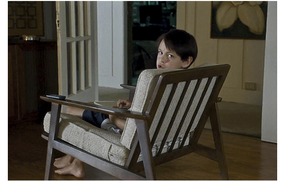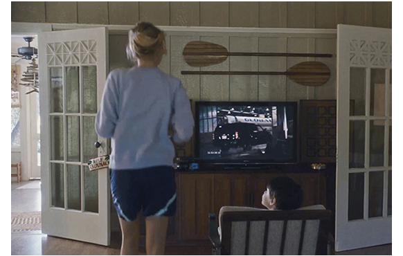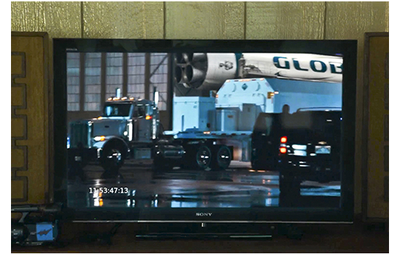 翌日、両親がいない時、イング大尉がジョギングの途中でミッチェルの家を立ち寄る。ブライアンと一緒に招待されたことと、将校クラブの向かい側にある家なので、立ち寄り易かったのであろう。姉が、「赤ちゃんの子守がやらされてて」と言うと、それを聞いたミッチェルは、当然、「黙れ」と怒る(1枚目の写真)。大尉もふざけて、「やあ、赤ちゃん」。睨みつけるミッチェル。「冗談よ」と謝って中に入ってきた大尉、ミッチェルが壁のTVで見ている映像を見て、「何、見てるの?」と訊く。「僕が撮ったビデオ」(2枚目の写真)。「君が撮ったの? すごい」(3枚目の写真)。最初は、何の気もなしに見ていた大尉だったが、画面にグローバル・ワンのロゴの入ったヘリコプターが映ると急に真剣になる。グローバル・ワンは大富豪カーソン・ウェルチの会社のロゴだ。思わず、「嘘でしょ」と言う大尉。トレーラーから何かを衛星に積み込もうとしているのだ。ミッチェル:「あれ、何だと思う? すごく大きいね」(4枚目の写真)。「とても高機能そう」。「極秘作戦だよ、太平洋全体を巻き込むような。絶対さ」。「いつ撮ったの?」。「真夜中。2日前」(5枚目の写真)。この映像から、大尉は、衛星に本質的な「悪」があることを確信することになるという筋書きだが、幾らなんでもこの映像だけから、衛星を破壊してしまうのは無理がある。これも脚本の欠陥。