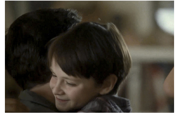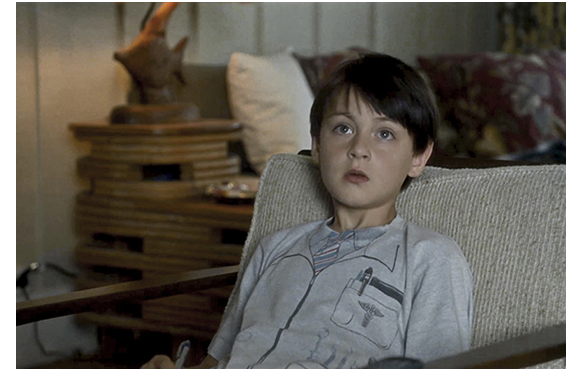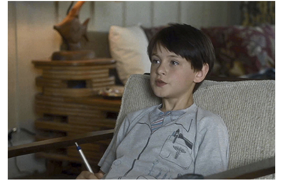 ブライアンが夕食に訪れるシーン。家族と一通り言葉を交わしたブライアンを、ミッチェルが自分の部屋に「ギルグレストさん」と呼び入れる。天井のかんむり座の装飾や、壁のロケットを見た後、ミッチェルのパソコンに映っている2匹のハムスターの交尾シーンを見て、「こりゃあ、面白いな。可愛いカップルだ」。それから、ミッチェルの質問が始まる。「もう少しで、ママと結婚してた?」。「何度もな」。「ママと別れる人が いるなんて」(1・2枚目の写真)。話題を変えたかったブライアンは、部屋にあった『再来』というタイトルの本を取って、「これ何だ?」と尋ねる。「ロノの再来だよ」。「4つ目と5つ目の前兆がある。神への犠牲とその傷の癒しだよ。あなたロノなの?」。(3枚目の写真)。「神話の結末如何だな、それで、俺の夏休みの過ごし方が決まる」。「神話の最後は、ペレがロノに要求するんだ、火山に連れて行けと。そこで千年の間、復讐のセックスをする」(4枚目の写真)。「抜け出せるのは、噴火の時だけ。すると、新しい島ロイヒが生まれて、あなたは雨粒になる」(5枚目の写真)。「悪くない 取り決めだ」。「あなた、ロノだよね」(6枚目の写真)。ジェイデンが最も長くしゃべる見せ場のシーンで、表情も変化に富んでいる。しかし、この部分、評論家には極めて受けが悪い。ハムスターの交尾シーンをネットで見ていること自体、8歳の子がポルノ・ファンであることを示唆し、それを裏付けるように「千年の復讐のセックス」という言葉を口にしたり、そのおぞましい結末を「悪くない」と発言している点、さらに、ブライアンがロノということは、彼と母の激しいセックスを許容している点などに非難が向けられている。欠陥脚本に対する最大限のクレームだ(One of the biggest mis-steps of the screenplay)(Mitchell actually wants the ex and his mom to have sex?!)。しかし、こうした白人の批評で忘れられているのは、ハワイの神話からの逸脱という、もっと重い罪についてだ。神話には、どこにも、このようなエロチックなことは書かれていない。だから、脚本は二重の意味でお粗末かつ許し難い。