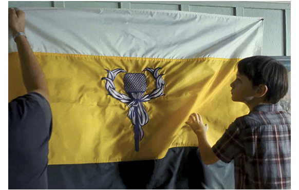 脳天気な映画なので、結局、①ブライアンは、衛星を破壊し、最初は軍の幹部から総スカンを食うが、結局衛星に内緒で核兵器が積んであったことが分かり、お褒めの言葉を頂戴する、②家を出ていった夫は、自分の娘がブライアンの子だと知りつつ、寂しさのあまり、元に鞘に戻る、③ブライアンは、一緒に衛星を壊したことから、一歩引いていたイング大尉とうまくいく。何でもありのハッピーエンド。ブライアンは、元カノの家を永遠に出て行く前に、ミッチェルに旗をプレゼントする。先住民によるハワイ独立運動の旗だ。「ぴんと張らない方がいい。いいな。波打つ感じだ。それが、旗を飾る時のコツ」(1枚目の写真)。「いいね」。車で家を去るブライアンに向かって親指と小指を上げて見送るミッチェル。ハワイの伝統的な挨拶のサインだ(2・3枚目の写真)。あらすじはこれで終わり。ジェイデンが出演しているのでなかったら、絶対に観なかった史上最低の映画だ。こんな映画に主演させられたジェイデンも、まさか、こんなひどい作品だとは思っていなかったろうから、大迷惑だろう。こんな映画に5.4もつけているIMDbには呆れれし、Rotten Tomatoesの20%も高すぎる。1.0と 0%で十分。