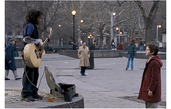 途中で果物屋のトラックに乗せてもらい、ニューヨークに着いたエヴァン。静かだった田舎とは違い、騒音で溢れる大都会の喧騒の中に、自分なりの新たな音楽を見出し興奮するエヴァン。頭の中の音楽に、腕を振って指揮している間に、うっかり名刺を飛ばしてしまう。途方にくれて街を歩き回るうち、きれいなギターの音に吸い寄せられる。それは、あまり売れないギター弾きの黒人少年アーサーだった。素晴らしい音のギターに触ろうとして叱られる。