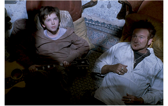 エヴァンは、その晩泊まる当てもないので、アーサーの後を追っていく。最初は敬遠されるが、「どこにも行く所がない」との言葉に、ピザと交換に、アジトに連れていってもらう。そこは、廃屋化した昔の劇場で、通称「ウィザード」と呼ばれる男が、音楽のできる子供たちをストリート・パフォーマーとして稼がせ、ピンハネして暮らしている。ちょうど『オリバー・ツイスト』におけるフェイギンのような存在だ。こうしたアジトは、他の映画でも登場するが、この映画の描写が最も非現実的だ。なぜかというと、ウィザードはピンハネするだけで食事を与えていない。食事で“釣る”のが常道なのに。アジトが寝静まってから、エヴァンはさっきのギターに電源を入れ、ネックとボディを両手で叩きながらリズムを生み出していく。それは、ギターを弾いたことのない人間にもできる音楽だった。その音楽の中に“天才”を感じたウィザードは、エヴァンを自分のねぐらに連れて行く。そして星を見ながら、自然の奏でる音は物理法則(倍音、音圧、波長)で支配され、体を通して伝わり、見えないが感じられると語る。エヴァンが「聴ける人は少ないの?」と尋ねると、「とても少ない」。要は、エヴァンは彼にとってお宝なのだ。