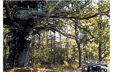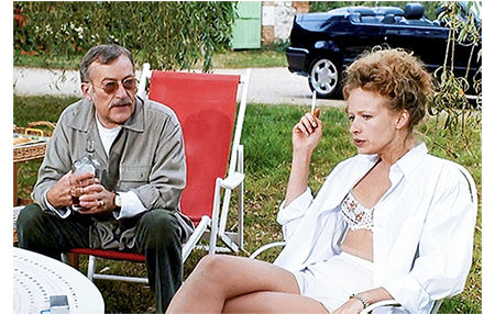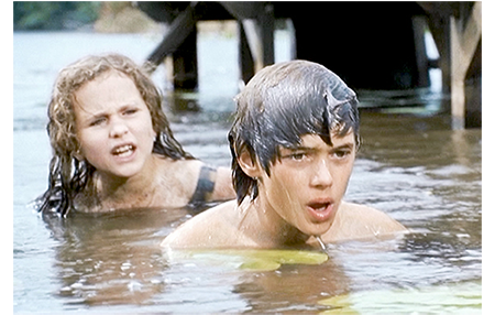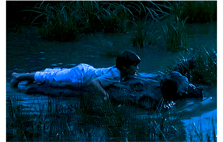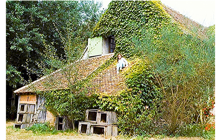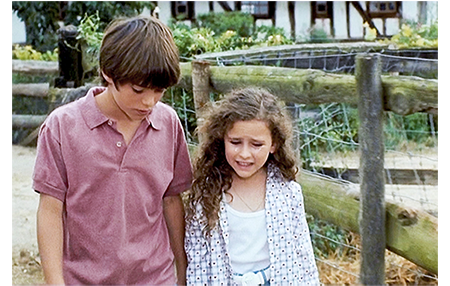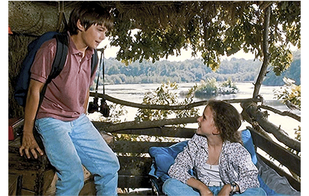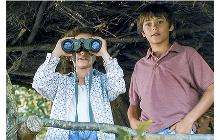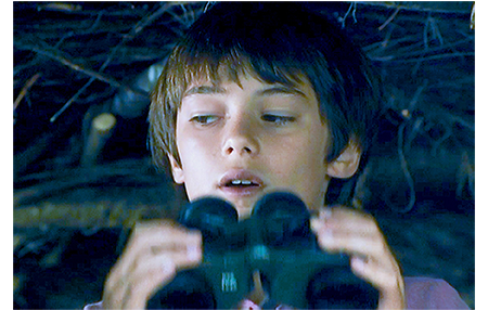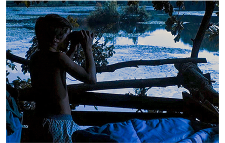 クレアは早速ジャンに会いに行き、夫がパリに行っていないから、池を案内して欲しいと、色仕掛けで誘う。鼻の下の長いジャンは、クレアをゴムボートに乗せて池に漕ぎ出す。クレアは、ジャンがどんなつまらないことを言ってもニコニコしているので、ジャンはすっかりその気に。一方、アントワーヌはリザをツリー・ハウスに案内する。「すっごい。あんたが作ったの?」。「そうさ。僕の家だ。毎晩、ここで寝るんだ。誰にも言うなよ」。その頃、ジャンは、マックスが4000万フランを埋めた小島に、「ガキの頃、『宝島』って呼んでたんだ」と言いながらボートをつける。クレアは、あまりにも偶然なので、当然下心があると考える。そこで、「宝物といえば、小っちゃな贈り物ありがと」と探りを入れる。ジャンには何のことか分からない。クレアは、ジャンがワルなので、しらばくれていると思う。そこで、さぐりを入れたり、さそい水をかけたりしているうちに、強引で野卑なジャンがクレアの胸をはだけてしまう。一方、ツリー・ハウスでは、木の幹に貼ってある母の写真のことを、「3年前、ビアリッツで撮ったんだ〔英仏海峡沿いの有名なリゾート〕。最後のバカンスだった。2ヶ月後に死んじゃった」と説明している。悲しくなったアントワーヌは、すぐに話題を変え、「夜光双眼鏡 覗いてみないか? 夜見えるようにできてるけど、ここを押すと、昼間でも見えるんだ」と言い出す。リザはさっそく覗いてみる。最初はカエルを見ていたが、向きを変えると、視野に入ったのはクレア(1枚目の写真)。「クレアが、あんたの従兄の上に乗ってる」。アントワーヌが双眼鏡を取って見てみる。そこで見えたのは2人のセックスシーン。思わず、「ウソだろ〔Oh, putain〕」と言って、リザの方をチラと見る(2枚目の写真)。小島では、コトが済んだ後、クレアが「びっくりさせてくれるんでしょ?」と催促する。どうやら、コトの前に、ジャンがそう約束したらしい。そして、ジャンが袋から出してみせた「びっくり」は、何とナチュラルホルン〔バルブ=ピストンがないホルン〕。そして、いきなりそれを吹き始める。クレアは、これで、ジャンがただの好色の田吾作に過ぎないことを思い知らされる。怒ったクレアはさっさと小島を引き払う。一方、農場では、シャツから200フランが出てきたとクレマンスが祖父を責めている〔アントワーヌは嘘をついていなかった〕。農場に戻って来たアントワーヌとリザ。「普通は、男が女の上に乗るんだ。逆だってことは、彼女が願ったんだ」。「分かってる」。「何で知ってる?」。「先月10歳になったのよ」。リザは涙が止まらない。「なぜ、泣いてる? あれ見たからか?」。「違う、気にしてない〔Mais non, je m'en fous〕! 彼はハクチ〔crètin〕で彼女はバイタ〔guidoune、カナダ方言〕よ!」(3枚目の写真)。「何だって?」。「バイタ」。「それ何?」。「知らないの?」。「ううん。カナダ語?」。「誰とでも寝る女」。「ここじゃ、売春婦って言うんだ」。「カナダでもよ」。