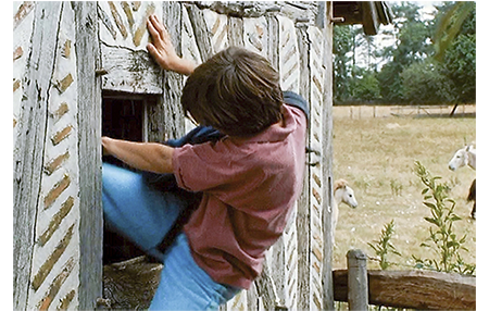 アントワーヌは、リザを慰めるために思い切った決断をする。リザが、動物を狩猟の対象にするために飼っているのは可哀そうだと言っていたのを思い出し、柵を開けてグレグワを逃がしてやることにする。「出るんだ、グレグワ!」(1枚目の写真)。出ようとしないので、近くにあったドラム缶を叩き、脅して逃がそうとする。しかし、ドラム缶を叩いたことで、不審に思った祖父が駆けつける。結果的に、グレグワは逃げ出すことができたが、アントワーヌは祖父に頬をぶたれる。リザはコテージに戻されるが、そこでは大喧嘩が起きていた。マックスが逮捕されかかったことで、リザの父は即刻カナダに向かうと言い出すが、クレアはお金を取り戻すまで帰らないと宣言する。そこに帰ってきたリザは、父から、「お前は、カナダのお母さんに家に戻るんだ」と言われる。あまりの急な話にリザは驚く。「もう、ここには いられなくなった。すぐ用意して来なさい」。「今、帰りたくない」。「反論はなし。言われた通りにするんだ」。「来たばかりじゃない!」。「怒らせるんじゃない!」。「アントワーヌにさよならも言ってない!」。リザは頬を引っ叩かれる。「荷物だ。5分で用意するんだ!」。怒ったリザは2階の自分の部屋に行くと、窓から抜け出す(2枚目の写真)。一方のアントワーヌ。グレグワを逃がした罰で、無慈悲な祖父によって小屋〔アントワーヌの部屋〕に閉じ込められる〔鍵をかけられる〕。アントワーヌはベッドに横になって考えると、ベットサイドの母の写真を見、次に窓を開け、誰もいないことを確かめる。そして、バッグパックを背負うと、窓から逃げ出す(3枚目の写真)。