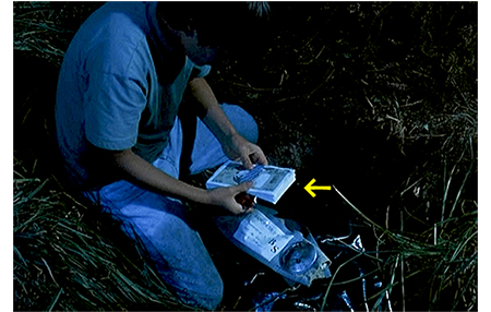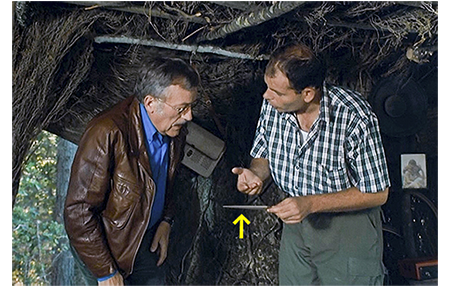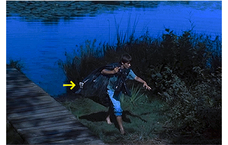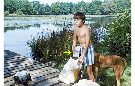 アントワーヌはオウムの鳴き声で目を覚ます。すると、何者かが池でボートを漕いでいる。さっそく、夜光双眼鏡をつかんで目に当てる(1枚目の写真)。モーターボートだが、静かなエンジン音でゆっくり走っている。ボートが小さな島に接岸したのを見届けると、アントワーヌはそっと梯子を降り、岸に置いてあった丸太にうつ伏せに乗ると、手で漕いで小島に向かう(2枚目の写真)。小島では、3人がシャベルを使って穴を掘っている。アントワーヌが水草に隠れて見ていると、警察署で銀行強盗だと確認した男マックスがいる。もう1人は現金輸送車を運転してした男だろうが、3人目は何とリザの父親だった。彼が祖父のコテージを借りたのは、このためだった。アントワーヌは愕然とする。水鳥が羽根をバタつかせ、アントワーヌが見つかりそうになる場面もあるが、幸い気付かれずに済んで3人は小島を離れる。アントワーヌは入れ替わるように上陸し、柔らかい土を掘り起こす。中には大きな黒いビニール袋が埋めてあった。アントワーヌがナイフで袋を切って手を突っ込むと、出てきたのは帯付きの500フラン札(3枚目の写真、矢印)。盗まれた4000万フランがここにある!