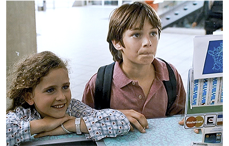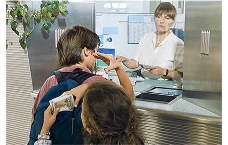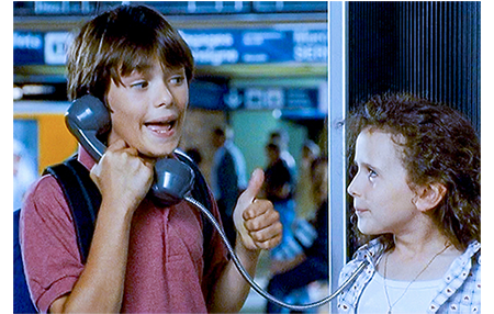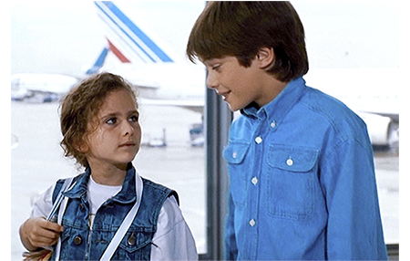 ラストシーンはパリの空港で。リザは1人でカナダに帰ることになり、アントワーヌと父が見送りに来ている。父は、呼びに来たエアフランスの係員に、「あの子のお父さんは入院中なんだ。重病でね、10年はかかるんだ」と説明する。「10年も?」。「リハビリとかナンかを入れてだよ」。アントワーヌは、「カナダまで会いに行くよ。チケット代くらい残しておけばよかった」と言って、リザを笑わせる(1枚目の写真)。「パパ、刑務所は長いかしら?」。「知らないな。長いかもね」。「可哀そうだけど、仕方ないわね」。係員から声がかかる。2人は立ち上がる。「書くの苦手だけど、毎日書くよ」(2枚目の写真)。この後、リザは変なことを言い出す。「カナダじゃ、ヘリコプターで脱獄するのよ」「あんた、幾つになったら免許取れる?」「パパを刑務所に置いとくの可哀そうだわ」。アントワーヌには、この謎かけの意味がようやく分かる。「僕に、また柵を開けさせたいのかい?」(3枚目の写真)〔リザのパパを逃がす〕。