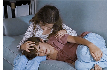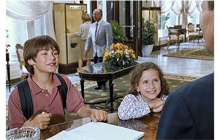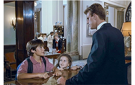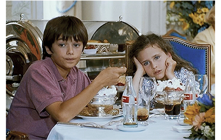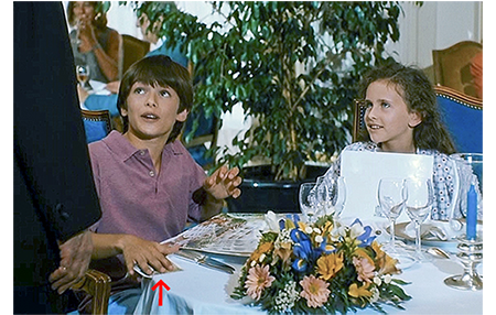 部屋に戻ったアントワーヌは急に悲しくなる。3年前、このホテルに母と来たことを思い出し、涙がとまらなくなる。女の子に涙を見せたくないので、アントワーヌはソファに横になり、両手で両足を抱え込んで丸くなっている。それを察したリザは、アントワーヌの頭を膝に乗せると、「男の子が泣いてもいいのよ。女の子だって同じ。泣けば気分がすっきりするもん」と優しくいたわる(1枚目の写真)。ホテルのフロントにマックスがやってくる。そして、部屋番号を訊き出すと、驚かせてやるからと言って、連絡させずに部屋に向かう。同じ頃、元気になったアントワーヌは、「お腹空いた?」とリザに訊き、「ぺこぺこ」という返事を聞くと、「町で一番のレストランに連れてくよ」と言って部屋を出る。片やエレベーター、片や階段を使ったので、両者はすれ違わずに済んだ。アントワーヌは、コンシェルジュにレストランのことを訊く。「バスク料理の専門店ならシベルタがお勧めです。すごくいいレストランですよ」。「予約しておいて」(2枚目の写真)。アントワーヌたちが出た直後にマックスがやってきて、行き先を訊き出す。レストランでは、メニューを持ったアントワーヌに、メートル・ドテルがお勧め料理を述べている。「ヤリイカのラビオリ、ビネグレットソース。ズッキーニとタイムの香りの豚の前足…」。アントワーヌは よく分からないので、「全部もらうよ」。「全部?」。「うん、おいしそうだもん」。メートル・ドテルは、「ご両親は知ってるのかな?」と不安がる。アントワーヌは、パパはボートで用があると言って、500フラン札をそっとテーブルに置く(3枚目の写真)。これだけ多額のチップをもらえば、顔がほころび、何でも言う通り。