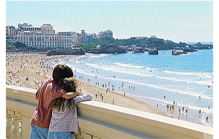 農場では、祖父が、「警察に知らせないと」と言い、従兄が、「待ったほうがいい」と言い返している。サン・ピエール・デ・コール駅には、なぜかマックスが現れ、切符売り場でリザの写真を見せて、2人が家出したから捜していると話す。係員はビアリッツまで行ったと教える。そして、バッグパックから500フラン札を取り出したことも。一方、TGVに乗ったアントワーヌは、すぐにクレマンスに電話をかける〔50度数のテレカルトを持っていなかったので、ボックスから出てきた人から500フランで買い取る〕。アントワーヌは、クレマンスに、「心配しなくていいよ。すぐ戻るから。2・3日 出かけるだけ」と話す。クレマンス:「みんな心配してるわよ。どこにいるの?」。「モンバゾン… 違う、ソリニーだ」〔モンバゾンは、サン・ピエール・デ・コール駅から10キロの町、ソリニーはその先5キロにある町〕。「どっちなの?」。「どんどん動くから… TGVに乗ってるんだ」(1枚目の写真)。驚いて最終目的地を訊いたクレマンスに、従兄には言わないと約束させた上で、ビアリッツのオテル・デュ・パレ(Hôtel du Palais)だと教える。ビアリッツで最高級の5つ星ホテルだ。電話が終わると、クレマンスは約束を守り、頼りにならない2人には行き先を告げるのを拒否する。「私が捜しに行く。あんたたちには会いたくないそうよ」。さらに、祖父に向かって、「あなた、自分のポケットを調べもせず泥棒扱いしたでしょ」、従兄に向かって、「あんたは、文字通りのバカ〔con〕よ」と非難。最後に「手紙は私宛て。行くのも私よ!」と宣言する。怪力の持ち主なので、2人とも逆らえない。列車から降りたリザは、「ホテルはどうするの? 子供だけだと変に思われるわ」と心配する。アントワーヌ:「電話すると、相手は僕のこと 『マドモアゼル』って呼ぶんだ」。次のシーンで、ホテルの予約係が、「ボンジュール・マドモアゼル」と返事している。それを聞いたアントワーヌは、「ほらね」という顔をする(2枚目の写真)。「こちら、メシニャック氏の秘書です。今夜2部屋ありますか? 子供たちと一緒です」。「申し訳ありませんが、スイートしか空いていません。5000フランです〔約10万円〕」。「それで結構です。予約して下さい」。なりすましが巧くいって、2人は大喜び。ホテルにはタクシーで乗り付ける。ロビーは、オテル・デュ・パレでのロケ(http://hotel-du-palais.com/visite360/tour.html でホテル内の各所が360度で見られる〔中央の×をクリックして消し、左下の■に似た印をクリックすると、見たい場所が画面下に一覧表示される〕)。2人の最後の関門はフロント。アントワーヌは、父は用事ができたので、先に行って待ってるように言われたと話す(3枚目の写真)。予約が入っているし、相手は子供なので、手続きなしで部屋に案内してもらえる。部屋はホテルで一番豪華な部屋ではないが(先のサイトで見られるSuite Royale Edouard VIIは芸術的)、部屋から出られるパノラマテラスは広くて素晴らしい(ここだけ別のスイートなのか、共用なのかは不明)。テラスの手すりにもたれた2人はまるで恋人同士のよう(4枚目の写真)。因みに、5枚目の写真は、先のサイトで、Terrasse Panoramiqueを選んだもの〔4枚目の写真の場所の全景〕。