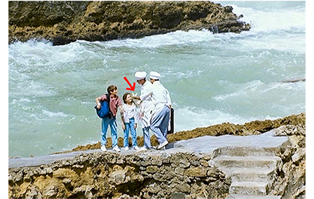 2人の飲物はコーラ。最初の料理はヤリイカのラビオリ。かなりの量だがペロリと平らげた上、パンでぬぐって皿をきれいする。3皿目まで映るが、マックスは、レストランの外で惨めにホットドックをかじっているのが面白い。その頃、クレマンスがビアリッツの駅に到着する。レストランでは、アントワーヌが、山のように生クリームがのったデザートを食べている。しかし、リザはぼうっとしてあらぬ方〔水槽〕を見ている。「もう食べないの? 何を見てるの?」。「ロブスター」。そして、「茹でられる前の檻(おり)ね」と言う(1枚目の写真)。この、助けてやって、というサインを受け止めたアントワーヌは、メートル・ドテルに全部もらうと告げる。次のシーンでは、大きな容器いっぱいのロブスターを2人のコックがタクシーに入れている。そして、子供たちと一緒に海岸に向かう。マックスもタクシーで追う。海岸に着くと、コックはロブスターを海に帰してやる。それを見ているリザはすごく満足げ。帰り際にアントワーヌが1人に1枚ずつ500フランを渡す(2枚目の写真、矢印)。それを上から見ているマックスは面白くない。大事なお金がどんどん無駄に失われていく。アントワーヌは海との仕切りの壁のような場所の上に立つと、バックパックを掲げ、「これ、好きにしていいよ」とリザに訊く。「世界中の檻だって開けられる。誰にもぶたれない。これを見せればみんなお辞儀する。君より年は上だけど、君の方が大きいんだ。4000万持ってるからね。僕たち何だってできるんだ」。そう言うと、アントワーヌは1束の500フラン(100枚)を海に向かって投げる(3枚目の写真)。DVDの表紙にもなっている有名なシーンだ。それを上から見ているマックスは腹が立って仕方がないが、警官がいるので降りていけない。