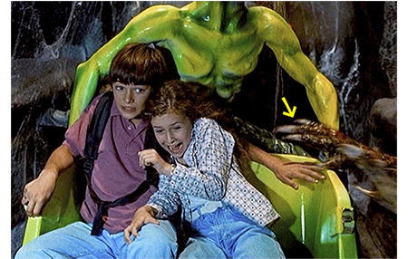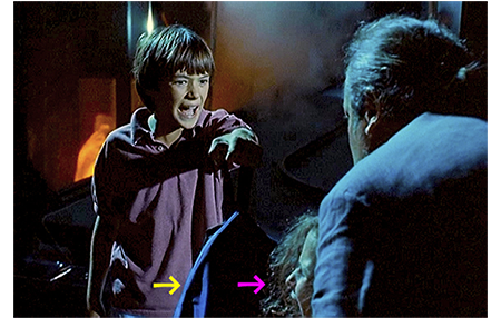2人は、ライド式のお化け屋敷に入る。マックスが、すぐに後を追って中に入り〔ライドが出て来た時に、開いた扉から無理に侵入する〕、それを見ていたクレマンスも、次のチャンスで侵入する。ライドは、両方から手が出てきて、結構気持ち悪い(1枚目の写真、矢印は化け物の手)。2人の乗ったライドが突然停止し、リザがマックスにさらわれる。アントワーヌはすぐに後を追いかけ、「リザを放せ!」と叫ぶ。マックスは、「お遊びは終わりだ」と言うと、リザにナイフを突きつける。アントワーヌはバックパックを外すと、「金は持ってけ。リザを傷つけるな!」と言って、マックスに差し出す(2枚目の写真、黄色の矢印はバックパック、ピンクの矢印はリザ)。しかし、こんなはした金でマックスは満足しない。バックパックを叩き落とすと、「残りを返せ!」と迫る。アントワーヌは、「助けて!」と叫ぶ。そして、その声を聞きつけたクレマンスが、正義の味方よろしく現れる。そして、腕で思い切り張り飛ばすと、マックスは、ペンキの貯まったタンクに落ちていく(3枚目の写真)。