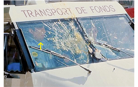 映画の冒頭、主人公の11歳のアントワーヌが野生の小鹿と戯れるシーンがタイトルバックに流れる。これで主人公が田舎で暮らしていて、心の優しい少年であることがわかる。1枚目の写真を珍しく題名と合わせたのは、笑顔が一番良かったのと、凝った題名を見せるため。フランス語で “cache-cache” は「隠れんぼ」を意味する。これと、スペル・発音が似た英語由来の “cash(現金)” を組み合わせることで、「現金を使った隠れんぼ」という内容が読み取れる仕組み。題名表示では、両端の2文字を太くして “cash” を強調している。因みに “cache” の発音は、正式には「カシュ」。だから、題名は「カシュ・キャシュ」。邦題は、この発音と意味を加味して、「キャッシュをかくせ」とし、「き」と「か」でまとめた。さて、その後、場面は近くの町デュイゾン(Dhuizon)のオープンマーケットに替わり、ウラジミール・コスマの軽快な主題曲が流れる(https://itunes.apple.com/mx/album/cache-cash-bande-originale-du-film-de-claude-pinoteau/956527295 の3つ目をクリック)。そこに、アントワーヌが2人の女性と一緒に現れる。1人は、がっしりした体の中年のおばさんで名前はクレマンス。アントワーヌが暮らしている祖父の農場のNo.1の働き手。超怪力の持ち主。もう1人はクレマンスの姪ルイゼットで、家事を手伝っている。だから3人は町まで買出しに来ている〔朝の9時頃。夏休みの期間〕。アントワーヌは買ったものを運ぶお手伝い。学校の友達が、父親の屋台に並んでいるトマトを手に取ると、いきなりアントワーヌの顔にぶつける(2枚目の写真)。怒ったアントワーヌは、買い物袋から生卵を2つ取り出すと友達に向かって投げるが、そこに「現金輸送車」と書かれた車が割り込んできて、卵はフロントガラスに命中(3枚目の写真、矢印が助手席の男マックス)。ワイパーがウォッシャー液で卵を洗い落とすと、助手席から睨む男の顔が見える。アントワーヌは山羊の後に隠れて見つかるまいと必死。