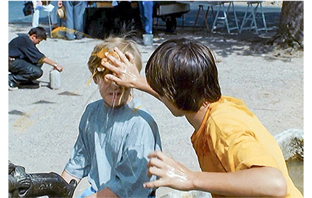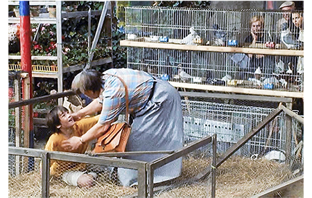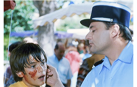 現金輸送車が去り、アントワーヌがホッとしていると、いきなり耳をつかまれる(1枚目の写真)。相手は警官で、「刑務所に放り込んで欲しいか?」と脅される。「ワザとやったんじゃ…」。「今度やったら両親に注意するぞ」。トマトをぶつけた友達は、申し訳ないと思ったのか、井戸水で顔を洗うのを手伝う。しかし、そんなことでアントワーヌは許さない。隠し持った卵を相手の頭に叩きつける(2枚目の写真)。そして、2人は仲良く別れる。すると、ハイティーンの不良2人がルイゼットに近づき、お尻をさわって絡む。間に割り込んで救おうとしたアントワーヌが鶏(生きている)を売っている木の囲いの中に投げ飛ばされると、それに気付いたクレマンスが柵を踏み倒して助けに入る(3枚目の写真)。その後、クレマンスはアントワーヌを虐めた男をつかみ上げると、腹に強烈な頭突きを食らわし、そのまま地面に押し倒す。2人組は逃げて行く。その時、サイレンを鳴らしたパトカーが、近くにあった銀行に乗りつけ、警官が中に飛び込んでいくのが映る。