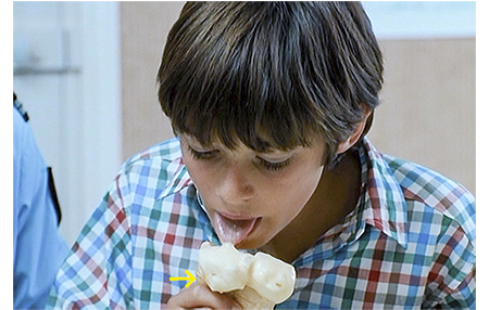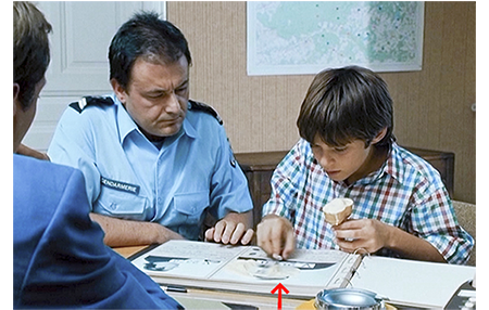 パリの「シャルリー・エブド」〔2015年1月7日の悲惨な襲撃事件で知られる週刊新聞〕で働いている父のところにアントワーヌから電話が入る。4000万フラン〔約7億8000万円〕の銀行強盗が目の前で起きたので、興奮状態だ。「きっと、パリからいっぱい新聞記者が来るよ」(1枚目の写真)。父も記者なので、来て欲しいという願いがこもっている。しかし、父は、「それなら次の木曜だな。話せて良かったよ」とすげない。アントワーヌはがっかり。父は、2年10ヶ月前に妻(アントワーヌの母)を亡くしている。アントワーヌが、いつから、どのくらいの頻度で祖父の家に来ているのかの説明は一切ない。しかし、大きなツリー・ハウスもあることから、小さな頃から祖父の家によく滞在し、母を亡くしてからはずっと暮らしているらしいことは想像がつく。父があまり会いに来ないことも〔デュイゾンは、パリの南南西約150キロ/父が東京、アントワーヌが静岡市といったイメージ〕。父は、1ヶ月近く会ってないことを思い出し、電話をかけ直す。そして、週末に行くと伝える。アントワーヌの機嫌が急に良くなる。次のシーン。時刻が11時少し前なので 翌日であろう。アントワーヌがクレマンスに連れられて立派な警察署に入って行く。署に入ると、待っていたのは、耳をつかんだ警官。パリから来たという重罪犯担当の警部〔1995年までは制服を着ていない警部という階級があった〕に引き合わされる。そして、「マーケットでバンに卵を投げたろ?」と訊かれたので、アントワーヌは真っ青。しかし、それは杞憂で、アントワーヌが卵をぶつけた現金輸送車に乗っていた2人が銀行強盗。アントワーヌには その顔を見た可能性があるので、「来ていただいた」のだ。アントワーヌは、アイスクリームをもらい、舐めながら、犯罪者の写真集に見入る。かなりめくったところで、舐めた拍子にアイスクリームの半分が写真の上に落ちる(2枚目の写真、矢印)。警官が、ペーパーナイフで落ちたクリームを取り始めると、アントワーヌは、ハッとしてペーパーナイフを借りる。そして、ワイパーで徐々に卵が取れていった状態を再現する(3枚目の写真、矢印)。その写真の男が、助手席に乗っていたマックスだった。「彼だよ」。「確かか」。「うん、ぜったい」。アントワーヌは警部に感謝される。