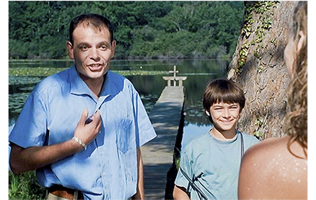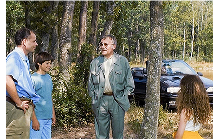 アントワーヌがツリー・ハウスの上からビデオで撮影をしている〔ツリー・ハウスは、かなり大きな木に作られている(イライジャ・ウッドの『8月のメモワール』を思わせる)〕。ビデオでも白黒画像なのは、ビューファインダーがまだ白黒の時代だからなのだろうか?〔調べてみたら、国産品では1992年からカラー化が始まる〕。ツリー・ハウスからは池が一望でき、そこに設けられた長い桟橋から全裸の女性が飛び込む姿も撮影してしまう。そこに従兄のジャンがジープで乗り付けて「アントワーヌ」と怒鳴って呼ぶ(1枚目の写真)〔ジャンは祖父の農場を任されている。ジャンの父がどうなったのかは不明。奥さんはいない/従兄といっても、最初は伯父かと思ったほど年が離れている〕。「カメラ盗んだの、お前か?」。「必要だったんだ」。「触るなと言ったろ! 降りて来い!」。ジープに乗ったアントワーヌは、水辺のサギを撮っていたら、全裸の女性が池に飛び込んだと話す。従兄は信じようとしないが、ジープで桟橋まで来ると、脱いだシュミーズが置いてある。「これで信じるよね?」。さらに、美しい女性が水面から顔を見せ、「ちょっと後ろを向いていて」と頼む。OKの声がかかって2人が振り返ると、シュミーズ姿の女性が、「暑かったから我慢できなかったの」と話す。従兄は、この池は私有地内にあるので遊泳禁止だが、「あなたが何も着ずに泳ぐのなら、目をつむりましょう」と、結構きわどい発言をする。一方の女性は、家を借りた時、池で楽しんでいいと業者に言われたと話す。この言葉で、彼女が 祖父のコテージの新しい借り手と分かり、独身の従兄は にこやかに自己紹介する(2枚目の写真)。女性の名前はクレア。そして、「またね」と言うと、池の端に立って、「リザ?」と呼ぶ。「お父さんが来たわよ」。乗用車が近づき、従兄はアントワーヌの撮ったビデオを嬉しそうに見る。「ね、嘘じゃない。嘘なんかつかないよ」。その時、リザが顔を見せ、アントワーヌの目はそちらに釘付けになる。そこに父親が車から降りて挨拶に来る。リザは、もっとここにいたいと言い出すが、一人では危ないと父は反対。従兄は、先ほどのアントワーヌの顔を見ていたので、恩返しとばかりに援軍を繰り出す。「後で、私が送って行きますよ」。これで、誰もが満足する結果となった(3枚目の写真)。
