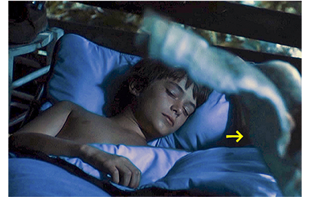 アントワーヌがツリー・ハウスに登っていくと、そこには先客がいた。リザが、「待ってたわ〔Je t'attendais〕」と迎えてくれる。「めった打ち〔raclèe〕にされたんだ」〔柵の所でぶたれた後で更に叩かれたことになる〕。「痛かった?」。「ぜんぜん」(1枚目の写真)。リザは、自分も父に叩かれたと話す。リザ:「あんなトコにいたくない」。「一緒に行こう」。「どこへ?」。「うんと遠くへ」。「素敵だけど、お金がいるわ」。「持ってるよ」(2枚目の写真、矢印は3年前の母の写真)「4000万あるんだ」。アントワーヌは、古木の又にできた窪みにビニール袋を隠してあった。袋を開け、「ちょっぴり頂戴しよう」と言い、映っただけで6束〔600万円分〕をバッグパックに入れる(3枚目の写真、手には3束、矢印の先に黒のビニール袋)。「これで何でもできるぞ」。リザは、「姿を見たの?」と尋ねる。「誰の?」。「お金を埋めた連中」。「ううん、暗かったから」。
