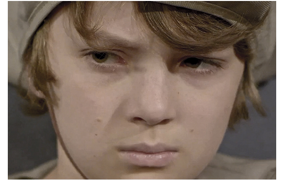 この不思議な言葉が何を意味するかは、その夜の放送で明らかになった。両親が楽しみにして始まったインタビューで、ルーカスはわざと寄り目をしていたのだ(1枚目の写真)。それを見てがっかりする両親。逆に、してやったりとばかりに喜ぶルーカス(2枚目の写真)。翌日、学校に行くと、前夜の放送でルーカスは注目の対象。といっても、墓地に行ったことで変人扱いされたり、嘘つき呼ばわりされたり、寄り目をからかわれたり、先生からは白い目で見られたりと、楽しいものではなかった(3枚目の写真)。