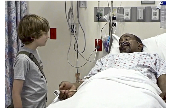 セラピーでは、元気が全くない。「今日は、パラパラ漫画はないの?」〔パラパラ漫画はルーカスの趣味〕。「ううん」。「何を考えてるの?」。「友達のルーカスに腹を立ててる。嘘付きなんだ」。「なぜ、嘘付きだって言うの?」。「いつも 生き方について話してた。実は、いつ死んでもおかしくなかったのに」。「じゃあ、あなたは、死ぬことに専念すべきだったと思うわけ?」。ルーカスには、返す言葉がない(1枚目の写真)。「先生の言う通りだ(I guess you have a point)」。いつもは生意気なルーカスだが、今日ばかりは違った。ルーカスは、ホスピスにお見舞いに行く。クリスは元気そうだ。「やあ、ルーカス、久し振りだな。元気にしてたか?」(2枚目の写真)。「大丈夫だよ」。挨拶の後、「最近、どうしてる?」と訊かれ、「考えてたんだ」。「何をだい?」。「自己改革(reinvent)しようかなって」(3枚目の写真)。「ホントか? 監督としてか?」。「それで、助けて欲しいんだ」。「いいとも」。こうして、クリスを巻き込んだルーカスの映画製作が始まる。