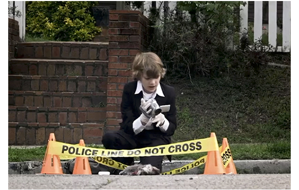 場所は、テネシー州ナッシュビル。11歳のルーカスが、撮影しながらビデオに向かってナレーションを吹き込んでいる。「また、轢死だ」(1枚目の写真)。「タイヤ痕から疑われるのは…」と言って、向かいの女性を写す。死んでいたのはリス。ルーカスが、轢死事故に拘っているのは、1年前、12歳だった兄ジェイクがスケボー中に老婆の運転する車に撥ねられて死んでしまったからだ。撮影は、母からの「ルーカス、朝食よ!」によって中断されるが、キッチンに入った後も、ノートパソコンで以前に撮影した墓地での埋葬シーンを確認する(2枚目の写真)。埋葬シーンの撮影がルーカスの最大の趣味なのだ。もちろん、それには兄の死が関係している。しかし、映画では、背景説明がないので、最初は単に気味の悪い少年としか見えない。母は、「カウンターにはラップトップを持ち込まないって約束したはずよ」と言うなり、動画のアップロード中なのを無視して、パソコンのコードを抜かれてしまう。映画は、その日の授業の一コマを描いた後、隣に住む同じクラスの女の子と一緒に歩いて帰るルーカスを映す。大形のヘッドホンで音楽を聴いているので、女の子が話しかけても無反応。家の前に着くと、今朝発見したリスの死骸の「その後」を撮影する。「なに撮ってるの?」。「別に。僕の映画のためのBロール〔資料映像〕さ」(3枚目の写真)。「ひき逃げね。多分あの人よ」。少女が想像したのも同じ女性。余程受けが悪いのか。