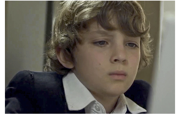 母:「電話がひっきりなしに掛かってくるわ」。父の方は、マーケティング代理店からの手紙を読んでいる。「息子さんと一緒に一度お会いして、今後の戦略を一緒に立てさせて欲しい」という依頼文だ。こうなってくると、ルーカスはもはや一種の商品だ。母:「来週のインタビューのスケジュールを立てておいたわ」。「僕には、選択の権利もないの?」(1枚目の写真)。スケジュールに熱中しているので、「なんて?」と母。そんな母に向かって両手で念力をかけるような仕草をするルーカスが可愛い(2枚目の写真)。そんな姿を見た父が、「なあ、坊主、大変なことは分かる。だが、これはウチにとっていいことなんだ。お金が必要だからな」。イライラしながら部屋に戻ったルーカスは、壁に貼ってある「尊敬する映画監督」の写真を見るうち、名案を思いついて満足そうな表情になる(3枚目の写真)。