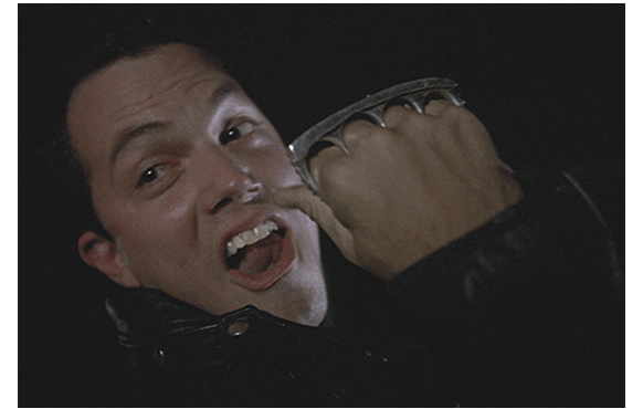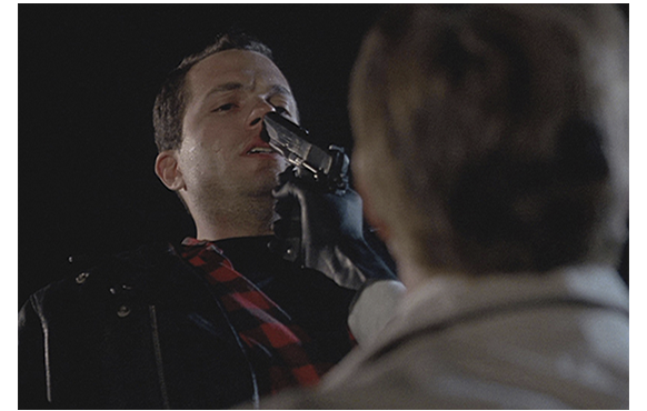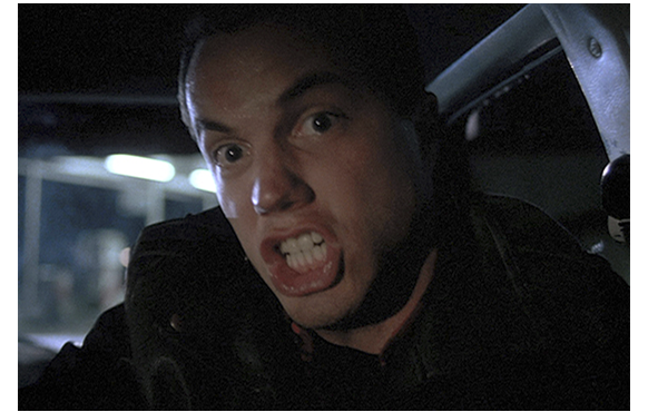 コーエンに止められたため、怒り心頭で、「脳ミソを座席にぶちまけてやるぞ、クソガキ」と毒づくテイト。これに対し、放ったトラヴィスの一矢がすごい。侮蔑を込めて「Pussy」と言ったのだ」(1枚目の写真)。いろいろな意味にとれるが、「ま○こ」「弱虫」「カス」等々、最大の侮辱であることは確か。猛然と飛びかかるテイトと、「いい加減に やめんか!」と押し戻すコーエン。ここで、車は高速を降りる。あまりの悔しさに泣き出すテイト。被害妄想からか異様な目でコーエンを睨む(2枚目の写真)。その様子をうかがっていたトラヴィスが、もう一段、決定的な行動に出る。「おい、テイト」と呼び捨てると、顔に向かってツバを吐きかけたのだ(3枚目の写真)。テイトが「殺す(You’re dead.)」と振り向いたところを、コーエンが「終わりだ(That’s it)」と言い、射殺する。反動で車からふり落とされるテイト(4枚目の写真)。コーエンは車を停め、テイトの死体をトランクに入れる。その間、トラヴィスは、逃げないようハンドルに手錠で縛られる。