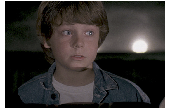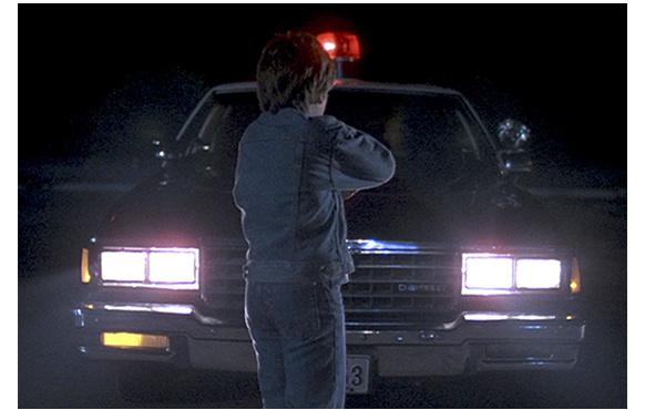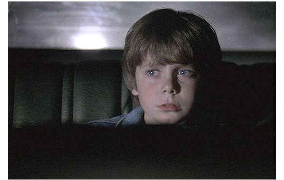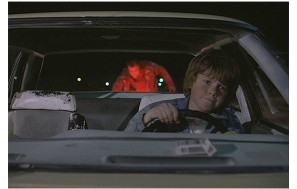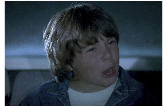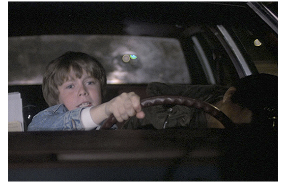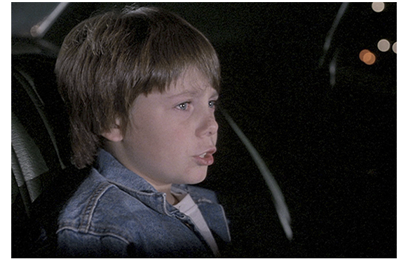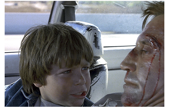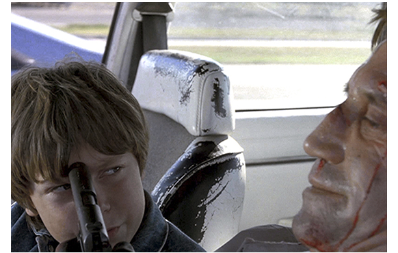 トラヴィスは、近くにあった大型トラック専用の給油所まで歩いていき、そこでパトカーに保護される(1枚目の写真)。車内で、警官に向かって、涙ながらに「ママとパパを撃った」と話す。「誰が 撃ったんだ?」。「2人の男。1人はホントの年寄り。名前はコーエン。もう1人は若くて、名前はテイト」。「今、どこにいる?」。「知らないよ。逃げてきたんだ。知るハズないだろ」。警官は、すぐに無線で知らせ、トラヴィスが誘拐された子だと分かり、署まで送られることになる。しかし、パトカーが高速を走っていると、追い抜いていく車がある。そこには2人の殺し屋が。「あいつらだ、逃げて!!」と叫ぶトラヴィス。犯人の車はパトカーの後ろに付くが、危機感のない警官は、トラヴィスの「殺される! お願い、逃げて!!」という懇願(2枚目の写真)にも平然と運転を続ける。実は、その少し前、同じようにトラヴィスが叫び、間違っていたので、信用していなかったのだ。コーエンは運転しながら、窓から身を乗り出すと、1発で警官の後頭部を射抜く。運転者がいなくなって蛇行するパトカーを、助手席から手を伸ばし、死体を押しやって必死でハンドル操作するトラヴィス(3枚目の写真)。リア・ウィンドウに銃撃で開いた穴が見えている。コーエンはパトカーの前に回りこみ、リア・バンパーにぶつけさせて、減速・停車させる。パトカーから引きずり降ろされ、テイトに車内に連れ込まれたトラヴィスは、後手に手錠をかけて後部座席に放り込まれる。そして、怒りに燃えるテイトから、巨大な銃を鼻に押し付けられ、「おい、チビ助、ちょっとでも動いてみろ。一言でもしゃべるか、動いてみろ。銃に触ってもいい。すぐ殺してやる。分かったか?」と威嚇される(4枚目の写真)。「銃を下ろせ、テイト」とコーエンに言われても、銃を突きつけたまま、「バーン!」と言って脅す。コーエンも頭にきて、力づくで銃を下げさせる。