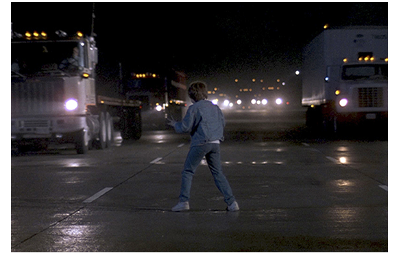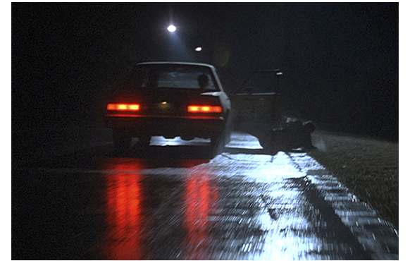 コーエンが運転を交代し、走行を開始。床に懐中電灯が転がっているのを見つけたトラヴィス。体をなるべく動かさないようにして拾い上げると、コーエンの後頭部を思い切り殴りつける(1枚目の写真)。実に思い切った行動だ。殴られたショックで1.5回転して停車する車。その瞬間、トラヴィスは後部ドアを開けて路上に逃げ出した。トラックが頻繁に通る高速道路を決死の思いで横断して逃げる(2・3枚目の写真)。CGのない時代なので、どうやって撮影したか分からないが、手に汗握るシーンだ。車が多いので、テイトも拳銃で撃つことができない。手をつかねている間に、トラヴィスは柵を乗り越え、道路外に逃げ出すことに成功する(4枚目の写真)。