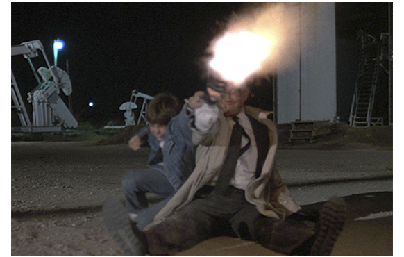 コーエンが、ジャッキを出そうとトランクを開けると、いきなりテイトが飛び掛ってきて、昏倒させられる(1枚目の写真)。テイトは、防弾チョッキを着ていたので命に別状はなく、さっきは車から落ちて気を失ったのだ。トランクが閉まると、トラヴィスの目には、怒りに燃えるテイトの姿が。ハンドルから離れられないので、トラヴィスは必死で4つのドアをロックする。テイトが窓を割って手を突っ込むが、トラヴィスは、エンジンをかけて、車をゆっくりと動かす〔パンクしている〕。テイトは、脚を怪我しているので、次第に車から引き離されていく(2枚目の写真)。まさに危機一髪だった。そこに、意識を取り戻したコーエンがやってくる。「奴を見たか?」。首を振るトラヴィス。コーエンがパンクを修理している間に、トラヴィスは手首にツバを塗って手錠から抜け出す。実にはしこい少年だ。気付いたコーエンが捜しに行き、結局は捕まる。車に戻る途中でテイトから銃撃されたと思い、銃を構えるコーエン。防御の姿勢が決まっている(3枚目の写真)。