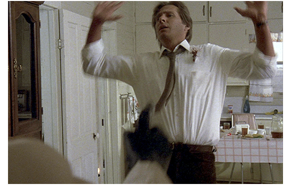 犬を追って行ったトラヴィスは、家から聞こえた銃声を聞きハッとする(1枚目の写真)。そして、玄関から入って「パパ? ママ?」と声をかけたところで、肩に手がかかる(2枚目の写真)。後の状況から判断して、この時、トラヴィスは、父母を見る前に、殺し屋コーエンに首の後ろを叩かれて意識不明にさせられ(deleted sceneによる)、連れ去られた。