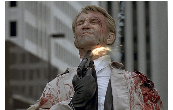 しかし、大破した車はすぐにエンスト。大量のパトカーが押し寄せてきて、銃を構えた警官に周囲を取り囲まれる。人質トラヴィスの首に銃を突きつけたまま、コーエンは、「何歳だ?」と訊く。「9歳」(1枚目の写真)。「9歳か」「すごいもんだ(How about that)」、と言い残すと、コーエンは拳銃を自分の喉に押し当て、引き金を引く(2枚目の写真)。壮絶な最後だ。