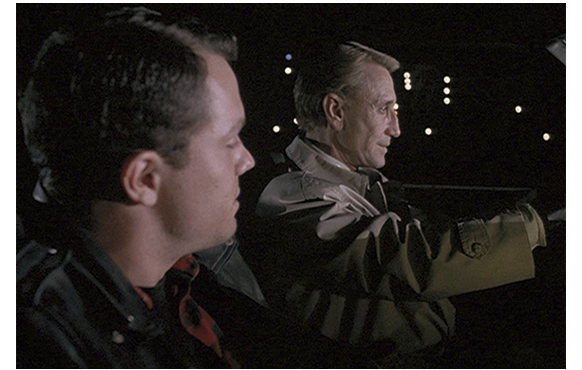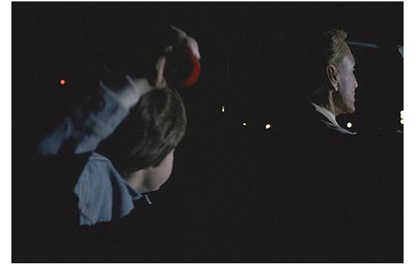 事態を収めようと、テイトにラジオをつけさせるコーエン。そこから流れてきたのは、警察が犯人2人とトラヴィスの特徴を公開して、大々的に捜査に乗り出したというニュース。「くそっ! 何てこった! チキショウ!」と焦るテイト。凶暴だが、気は小さい。2人も口論を冷めた目で計るように見るトラヴィス(1枚目の写真)。2人の犯人の間で、車の速度を巡って口論が起きる。「エンジンがイカレテ、こんなトコで立ち往生したらどうする?」と言うテイトを、コーエンが「テイト!」と一喝。そこに、トラヴィスが、「急いだほうがいい」と煽る。コーエン:「口出しするな」。「警官は、あんたたちの顔も車も知ってる」。「捕まるよ」(2枚目の写真)。テイトに鼻を殴られる。「何てガキだ」。そして、2人でまた口論。いつの間にか、前方に車の列ができている(3枚目の写真)。慌てて減速するコーエン。