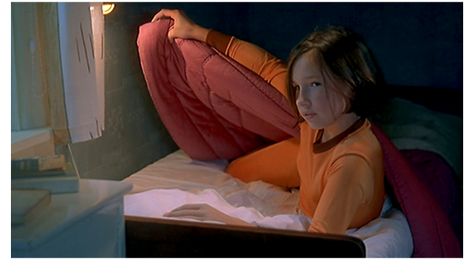 ベッドに入っても、言葉の脅しは続く。「雷で、真っ二つにされた人もいるの。家の中にいても安全じゃないのよ」。モルタンは、ぬいぐるみと一緒にベッドにもぐりこみ、激しい雷光に耐える。アニカは、「怖いんでしょ」とズバリ指摘する(1枚目の写真)。「ちょっとね」。アニカは、自分の布団をめくると、「いらっしゃいよ。あたしはちっとも怖くないから」と誘う(2枚目の写真)。モルタンは、怖くて死にそうなので、急いでアニカのベッドに走って行く〔ぬいぐるみは忘れない〕。モルタンは、アニカの背中に抱き着いて寝る(3枚目の写真、雷光が光った瞬間のアニカの満足そうな顔が印象的)。