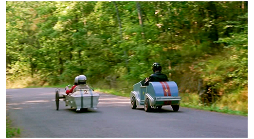 村の近くで一番道路が高くなっている所で、ハロルドの乗ったレーシングカートを押そうと悪ガキ連が用意している。そこに、お手製のレーシングカートにアニカを乗せたモルタンが、カートを押して近づいてくる。ハロルドの横まで来ると、モルタンはアニカの後ろに乗り込み、「レースするか?」と挑戦する。ハロルドは、カートから降りると、モルタンの胸ぐらをつかみ、「俺の親爺は、もうすぐそんな棺桶に入るんだ!」と言うと、道路にうずくまって悲しんだ後、レースに合意する。ハロルドのカートは2人、モルタンたちの手製カートは1人が押して斜面を下り始める。映像では、2人の方が少し早いように見える(2枚目の写真)。このあと、2台は道路沿って左に消えて行き、直後に衝突音が聞こえる。
