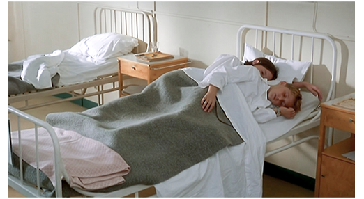 そして、画面が切り替わり、2人が病院のベッドに寝ている(1枚目の写真)〔ベッドの下の金属容器は尿瓶〕。そこに、意地悪そうな顔をした看護婦を先頭に、ヨハンソンとスヴォンストロムが入って来る。看護婦は、「女児は腕関節の捻挫、男児は異常なし」と、簡単に説明しただけ。ヨハンソンは、モルタンにキャラメル入りの紙袋を渡すが、彼が中から取り出そうとすると、袋ごと奪い取る。「お前には食べさせん。どこも悪くないからな」。この後、説教が続く。「あの丘は急で危ないんだ。あんな所で不必要に運を試すなどもっての他だ。許されることじゃない。お前は運がいいんだぞ。私が子供の頃、もしあんなことをしたら、鞭で叩かれていただろう。お陰で授業免除だ。だから、スヴォンストロム先生がここにいる」(2枚目の写真)〔責められるのは、いつもモルテン。学校も、モルテンのように優秀な子は行く必要がないし、教師も一度も教えていない〕。