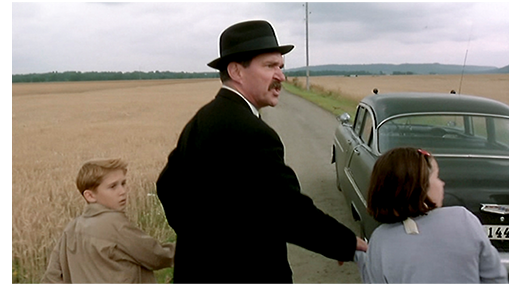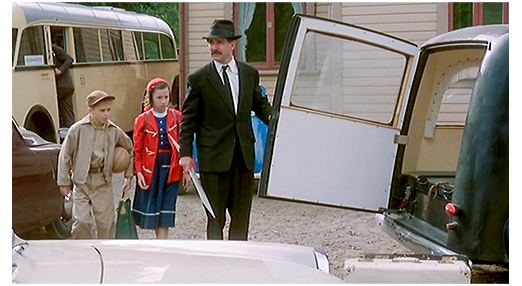 少年がホームに降り立つと、待ってくれている人は誰もいない。「…ママ、この夏、僕には2つの夢がある。1つは、スウェーデンがワールドカップで優勝すること〔1958年の開催国はスウェーデン〕。2つ目は、“夏のパパ” が “一年中のパパ” になること。今の里親は、僕のことが好きじゃないみたいなんだ。少なくとも、サッカーは大嫌い。あなたの息子モルテンからキスとハグを込めて」。その時、黒服の男性が2つの名を書いた大きな紙を持って近づいてきて、「モルテンか?」と訊く。「ええ」。「駐車場で待つように言っておいたはずだが」(1枚目の写真)「私は、イング・ヨハンソン。じゃあ、あっちはアニカかな?」。モルテンは一度も女の子と話さなかったので、「知りません」と答える。「見てみよう」。ヨハンソンは、モルテンを連れて女の子に近づくと、「アニカか?」と尋ねる。「ええ」。「駐車場で待ち合わせることを君も忘れたのか?」「2人とも、互いに挨拶するんだ。モルテンは頭を下げて」。ヨハンソンはモルテンの頭に手をやり、アニカに向かって下げさせる。「アニカは膝を曲げて」。ヨハンソンはアニカの肩を下げて、モルテンに “カーテシー〔女子の正式な挨拶〕” をさせる(2枚目の写真、矢印は曲げた膝)。ヨハンソンは2人の鞄を持つと、駐車場に停めておいた霊柩車に連れて行く。服装からも類推できたが、これで、ヨハンソンが葬儀屋だと2人にも分かる。ヨハンソンは2人を助手席には座らせず、後部扉を開け、棺を入れる場所に乗せる(3枚目の写真)。その時、黒人が自転車に乗って走って行くのを見て、「何てこった。ここ数日、黒ん坊を見かけるな。きっと同じ奴だろう」と、差別的な眼差しで嫌そうに見る。