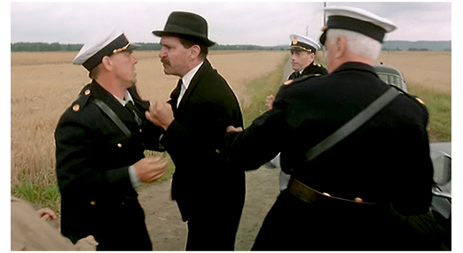 2人は、警官によって再び引き離される(1枚目の写真、矢印)。そして、2人を乗せたパトカーが、工場の門に差し掛かった時、ようやくヨハンソンが動き、パトカーのトランクを叩いて停め、警官が止めるのを押し切ってアニカを救い出す。邪魔をする警官は、力づくで押し退ける。そして、2台目にいたモルテンもパトカーから出す。3人の警官には、「今後、私の子供達に手を出すな」と命令し(2枚目の写真)、「お前らなんか、大嫌いだ」と罵倒する(3枚目の写真)。この場面はいいのだが、1つ前の中途半端な態度の直後だけに、どうしても違和感が残る。1つ前で、あのバカげた台詞を、なぜオルソンに言わせなかったのだろう? そうしていれば、ヨハンソンの “力づく” も納得できるのに…