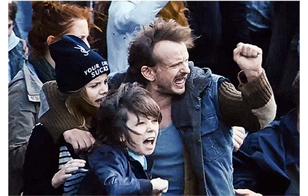 再開発予定地区では、フェンスが張られ、重機が並んでいる。タクシーで乗り付けたヴィニーとテオが中に入ろうとするが、入れてもらえない。2人はロルフを見つけて駆け寄る。「こんなとこで何してる。危ないぞ」。ヴィニー:「戦わなくっちゃ。そう言ったじゃないの!」(1枚目の写真)。その時、予定地区の中央に設けられた壇上に父と共同経営者とニールスン夫人の3人が揃う。そこで3人が署名し、この事業に対する夫人の出資が確定し、取り壊しが始まる段取りだ。ロルフは2人に「ここにいちゃダメだ」と言うが、ヴィニーは「ここにいる」と拒否。そこに、プラカードを掲げた開発反対グループがやってきてフェンスの前でシュプレヒコールをあげる。警官隊も到着し、一触即発の事態となる。警察の放水銃を見て困惑していた父は、反対グループの中にヴィニーとテオがいるのを見ると(2枚目の写真)、檀を降りて子供たちのところに駆け寄る。立ち去れと言う父に対し、ヴィニーは、「いやよ。ここにいる。ロルフを助けるの」と断る。父がいるのに気付いたマンニが、「クリーナがいるぞ! 俺たちの家を盗む気だ!」と叫んで殴りかかろうとするが、ロルフがそれを止める。マンニの父親が爆破ボタンを押すと、100メートルほど離れて停めてあった自分のバンが爆発する〔何の意味もないシーンなので、爆発の部分はない方がいい〕。その時、共同経営者がやって来て、父に契約書への署名を求める。契約書を手にして考える父。共同経営者は、周囲の群衆に向かって、「お前達の顔なんか二度とみたくない。とっとと立ち去れ!」とわめく。そのはしたない姿を見て、父は、「やめよう」と提案する。「やめないぞ!」。父は、契約書をびりびりに破り(3枚目の写真)、共同経営者に投げつける。「お前は、一生で最大の失敗をしちまったんだぞ!!」「違った。何がお前の最大の失敗か知ってるか?! このクソガキどもだ!!」。父は、共同経営者の顔を思い切り殴る。昨夜、ロルフに殴られたように。ロルフは、「あんたは俺たちの仲間だ。ありがとう」と言って父を抱きしめる。子供たちの前に行った父は、ヴィニーに、「悪かった」と謝る。ヴィニーは、「最後には、正しいこと したじゃない」と言い、テオは、「そうだよ、パパ」と、初めて「パパ」という言葉を使う。抱き合う父と2人の子供(4枚目の写真)。ナレーション:「どんな人生でも、決めなければならない時がある。何が本当に必要なことで、何が単なる欲望なのかを〔欧米では、“NEED” と “WANT” の対比が定番〕。そして、運が良ければ、その時に手を差しのべ、すべてを変えてくれる人が現れる」。映画は、1隻の船がシュプレー川を都心に向かって下って行くところで終わる。船には、一家3人とロルフが乗っている〔場所は、左岸にMolecule Manの像があることから特定できる〕。会話の最後は、如何にもテオらしい言葉で終わる。「ねえ、淋病が何かくらい知ってるよ」。「何だ?」。「セックスでうつるんだろ」。