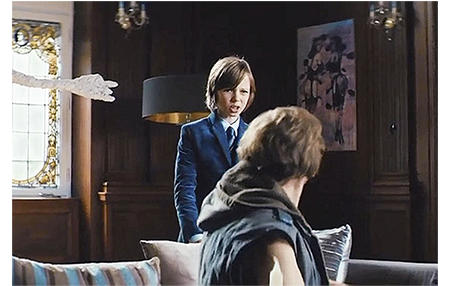 しかし、父が最初に電話をしたナニー紹介所では、父が名前を言った途端、電話が切られる。それを見てニヤニヤする2人。父は、「喜ぶのは早い」と言って、2つ目に電話をかける。ここは、電話を切らなかった。代わりに、「よくまあ電話をかけられますね。私たちのナニーがどうなったか忘れたんですか?」とだけは言ってくれた。1人目のナニーは、トイレの最中にテオが電気を流して感電、2人目のナニーは、寝ている間に、巻き毛の一部をハサミで切られ、額に「PENIS」と書かれ、鼻の下には髭も(1枚目の写真、矢印は切られた巻き毛)。一番ひどかったのは3人目。ナニーが玄関を見おろす場所に来ると、下では、テオがヴィニーの右腕を電動ノコギリで切断して立っている(2枚目の写真)。そして、テオはナニーを見上げると、「みんなお前のせいだ。次はお前だぞ、この淫売!」と言って睨む(3枚目の写真)。これでは、どこからも断られるハズだ。