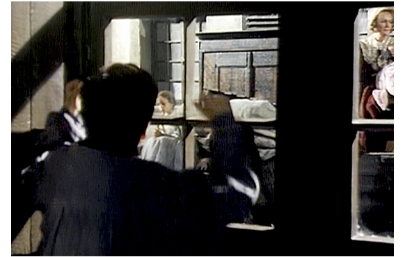 ハインリヒ、友達、アンナの3人が旅の一座の「ファウスト」の公演会場に向かって走って行く。アンナが「ハインリヒ、話があるの」と呼びかけても、「悪魔を見てやるんだ」と大乗り気で言うだけ。「でも、話さなくちゃいけないの」と言っても耳を貸してくれない。3人は裏口からこっそり忍び込み、カーテンに開いた穴から交互に劇を覗き見している(1枚目の写真)。もっと近くで悪魔が見たくなり、ハインリヒを先頭にカーテンの裏から舞台の脇へと出て行く(2枚目の写真)。そして、当然の成り行きとして、効果音の係に見つかってしまい、陰に連れて行かれて、「お前たち 何のつもりだ?」と叱られる。そして、「猿が2匹か?」と意外な言葉も。「ごめんなさい。悪魔が見たかった」と謝るハインリヒに、係は「悪魔が見たいのか。じゃあ、一緒に来い」と言う。アンナは最後にもう一度、「ハインリヒ、話すことがあるの。大事なことよ、お願い」と頼むが(3枚目の写真)、ハインリヒは、「行かないと。すぐ戻るよ、約束する」と言って、友達と一緒に楽屋に入って行く(4枚目の写真)。アンナは帰りを待とうと物陰に行くが、その間も何度か咳いている。典型的な結核の咳だ。