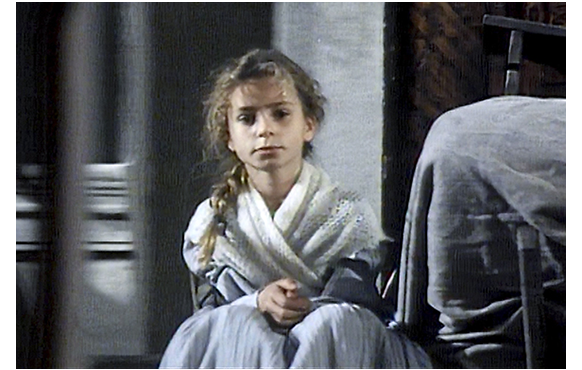 ハインリヒは直ちに、懲罰台の上で正座を命じられる。半分抗議の意味を込めてスノードロップを口にくわえるハインリヒ。それを見て生徒達は大喜び。教師は怒って罰が重くなってしまう。授業が終わり、暖房の切れた教室で、一晩中、食事抜きのまま、後手を縛られたまま正座を続けるハインリヒ。現代なら、体罰の限度を完全に越えているが、19世紀なら普通なのだろう。その時、ガラスの割れる音がして、アンナが窓越しに姿を見せる(2枚目の写真)。アンナは、割れたガラスの隙間から手を入れ、窓の錠を外し、教室に侵入する。ハインリヒが「音を立てるな。捕まっちゃうぞ」と注意する。アンナは、「分かってるわ」と言いつつ戸棚の上に登ると、「食べるもの、持ってきたの」と包みを解く(3枚目の写真)。そして、ハインリヒの手を自由にしてやる。お腹が空いているのでむさぼり食べ、骨が詰まって咳き込むハインリヒ。アンナは手で骨を取り、「今日は、私の命を助けてくれでしょ。だから、今度は私の番よ」。「てことは、一生一緒にいなくちゃね」。「そうよ、結婚するんだもん」。「結婚したら、キスするんだよ。前にキスしたことある?」。ううん、と首を振るアンナ。「僕もだよ」。そして、ファースト・キスをする2人。「どうだった?」。「お魚の味がしたわ」。