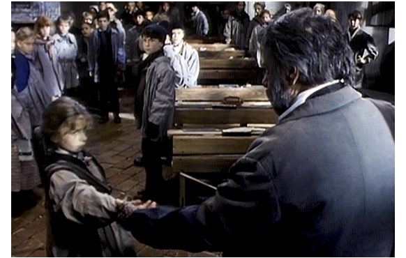 外では雪が舞うような寒い日、貧民学校の教室〔原作によると、全学年1つの教室で授業を受けている〕では、みんながまちまちなことをしている。教師がチーズを切っては食べていることから、一種のランチ・タイムなのかもしれない。19世紀の学校なので、現代の視点では推測できないが… 部屋は、生徒の人数の割に広く、天井は高い(1枚目の写真)。教壇の最後部左の一段と高い棚の上に生徒が一人正座させられている(矢印)。ここは懲罰台。悪いことした生徒が座る場所だ。両手を膝に置いたまま真っ直ぐな姿勢で何時間も正座させるのは、やられる方も大変だ。そのうちに、ハインリヒが縦笛を吹き始める。目線の先から、隣の列にいるアンナを想っての演奏だ(2・3枚目の写真)。