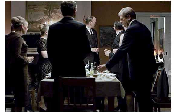 視察の日の夜、夕食の席で。オスカーソンが、アクスルの負傷について、「先ほど病院と話しました。入院期間は分からないそうです。手が助かるかどうかも」と院長に報告する。何も答えずに黙々と食べる院長。その時、遠くの方で電話が鳴り出す。誰も動かないので、院長は、「静かに食べたいと言わなかったか?」と催促。オスカーソンは、電話を取りに行く。その隙に、エリックは、「睾丸じゃなく手だったのは残念だったな」と言い、トリューとエルマを笑わせる(1枚目の写真)。「静かにせんか」。そこにオスカーソンが戻って来て、エリックを指差す。院長が頷いて許可を与えたので、オスカーソンは「エリック、ついてきなさい、電話ですよ」と話しかける。電話は叔父からだった。叔父の声が変なので、「母さん、大丈夫?」と訊く。「医者には救えなかった。試みたが、うまくいかなかった」。それを聞いて、母が死んだと誤解するエリック。「エリック、聞こえてるのか? 何か言えよ」。エリックは何も言わない(2枚目の写真)。エリックは、叔父からそれ以上何も訊かずに電話を置くと、泣きながら席に戻る。兄の異変に気付いたエルマが、「どうしたの、エリック?」と訊くと(3枚目の写真)、すかさず、レッスンが「静かに」と注意する。「叔父さんだった」。「しーっ!」。「母さんが…」。「黙って、食べるんだ」。涙の止らないエリックは、遂に、「間違いだ〔Det passer ikke〕!」と大声で叫ぶ。「静かに」。「間違いだ!」。そんな兄をドンドンと叩くエルマ(4枚目の写真)。エルマも、母に何かあったと気付いたのだ。エリックは、エルマから逃れるように、席から立って「間違いだ!」と叫ぶ。「座って、食べろ!」。
