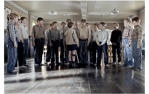 映画は、まず1961年5月25日にケネディ大統領が上下院合同議会で行った発表の映像を流す。「まず私は、今後10年以内に人間を月に着陸させ、安全に地球に帰還させるという目標の達成に我が国民が取り組むべきと確信しています」(英語)。1961年4月12日のガガーリンによる史上初の有人宇宙飛行を受けて行った歴史的な挑戦だ。この映画の主人公エルマは、月面着陸の準備が着々と進行する1967年、宇宙飛行士になることが夢で、いつも望遠鏡で空を眺めるような少年の1人だった。「1967年秋」とのテロップが入ると、紅葉の中を走る1台の車が映される。中に乗っているのは、兄エリックと弟エルマ(1枚目の写真)。ここで、独白が入る。語り手は、トリュー。グッビャ孤児院で兄弟と一番親しくなる少年だ。「グッビャへの旅は タイム・マシンのようなものだ。近付くにつれ、どんどんと過去へと戻っていく」。2人が孤児院に着いた頃には、辺りはもう暗い。「独特の臭い。そして、院長室に潜む 沈黙と影」。映画を最初に観ると、トリューなる人物はまだ存在しないので、この独白が何を意味するのかが分かりにくい。兄弟のどちらかの「回想」だと思ってしまうが、実は、兄弟が来るまでにグッビャの苛酷さに苦しめられてきたトリュー、兄弟と親しくなってから2人のことをずっと見てきたトリュー、エルマが達成したことに感銘したトリューが、振り返って兄弟の軌跡を語っているのだ。だから、最初のコメントは、兄弟が最初にやってきた日に思いをはせながら、自分自身の回想を述べている。中に入って行った2人。1人の教師が、「これを着ろ、エリック・ヨハンスン。お前は47番だ」と言って、パジャマのスボンを示す。「エルマ、お前は30番だ。服を脱げ」(2枚目の写真)。そして、ベッドがずらりと並んだ部屋に連れていかれる。もう消灯の時間が過ぎているので、中は真っ暗だ。「さあ、寝ろ。口はきくな。分かったか?」(3枚目の写真)。教師が出て行き、1人の少年が顔を起こして2人の方を黙って見る。トリューだ。「エルマは、ここよりひどい所だってあるんだと思ってた、と言っていた。しかし、それは彼がグッビャの実態を知るまでのことだった」。